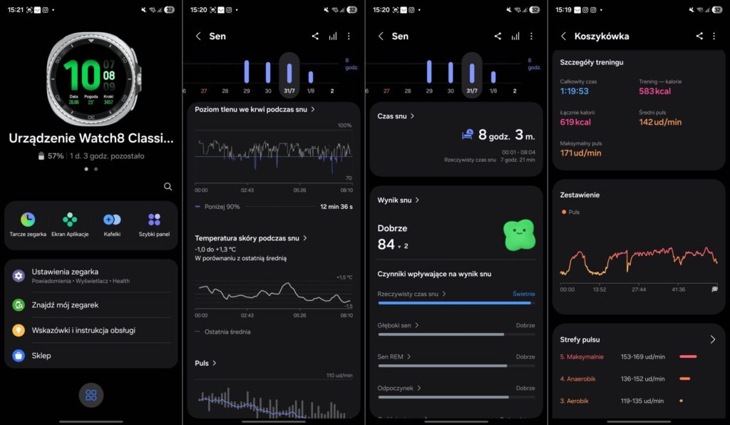 Ale skoro o zarzutach – jest niestety jedna rzecz, gdzie zegarek nie spełnia moich potrzeb. To bateria i czas pracy na jednym ładowaniu, o czym pisałem już na początku tekstu. Niestety Watch8 Classic nie jest w tej dziedzinie mistrzem. Dzień, noc (oby) i tyle – to wszystko co zdołałem z niego wycisnąć. Gdy wiedziałem, że np. idę na kosza – specjalnie go podładowałem, żeby spokojnie przespać noc. Gdy kładłem się i miałem jeszcze 25 proc. baterii – musiałem się zastanawiać, czy budząc się rano zegarek będzie działał. Działał – więc się udało, ale zostało mu tylko 8 proc. I to wszystko przy wyłączonym już po pierwszym dniu AoD. Ja testowałem na szczęście wersję bez e-SIM, zastanawiam się na ile w niej starcza energii bo wiadomo, że potrzeba jej trochę więcej. 445 mAh to niby przyzwoita pojemność, ale jednak przy tym systemie a przede wszystkim przy tej liczbie funkcji – to mało. Na Wear OS trzeba mieć sposób, ma go OnePlus (dwa procesory), ma go Mobvoi (dwa wyświetlacze), a Samsung jakoś nic wymyślić nie chce. Rozumiem, że Koreańczycy chcą być Applem w świecie Androida, a skoro Apple watche działają krótko, a mimo to się sprzedają, to i Galaxy Watche powinny iść jak świeże bułeczki. Ale chyba to co sprawdza się tam, tu sprawdzić się nie chce. W USA Apple rządzi a amerykanie jakoś nie chcą zmieniać swoich przyzwyczajeń, może tylko Garmin (również amerykański) bywa rozważany jako alternatywa. Ale w innych częściach świata, a już na pewno w Polsce, gdzie konkurencja, zwłaszcza chińska, jest bardzo duża, Samsung ma po prostu trudniej.