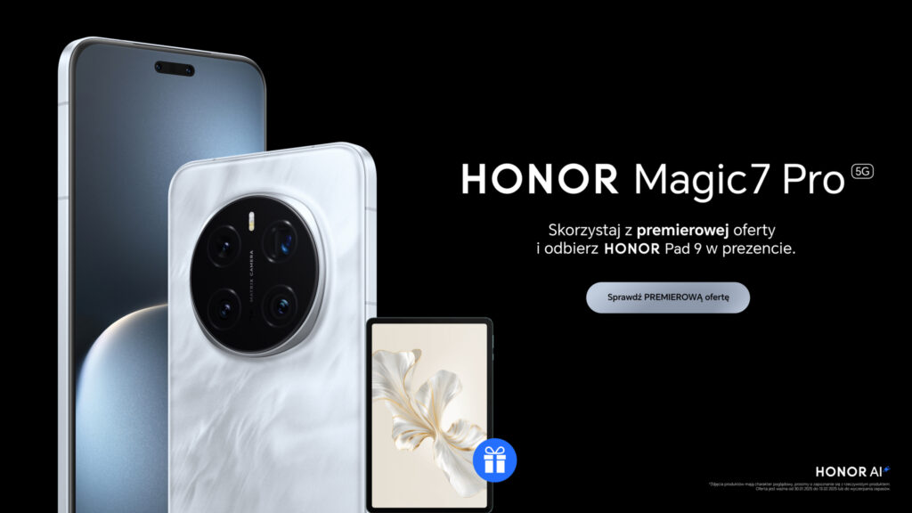 Zacznijmy jednak od ceny. Smartfon kosztuje 5799 zł, do 29 stycznia jest dostępny z tabletem HONOR Pad 9 Wifi. W zależności od kanału sprzedaży można znaleźć oferty z dodatkową bezprzewodową podstawką ładującą. Kolory są dwa, księżycowy szary oraz czarny.