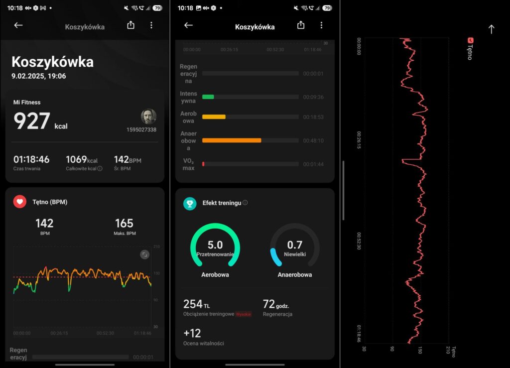 Do połączenia z zegarkiem służy aplikacja Mi Fitness, dostępna w Sklepie Play. Jest podzielona na cztery sekcje. To Zdrowie – z wynikami naszej codziennej aktywności, snu itp., Trening – gdzie znajdziemy dokładne dane z wykresami, Urządzenie – ze stanem baterii dostępem do wielu tarcz i ustawieniami funkcji zdrowotnych, powiadomień czy połączeń oraz Profil – z danymi z naszego konta i uprawnieniami aplikacji. Do zegarka można wgrać muzykę i sparować go bezpośrednio ze słuchawkami Bluetooth. Wszystko ułożone jest prosto i czytelnie – nie mam żadnych zastrzeżeń.