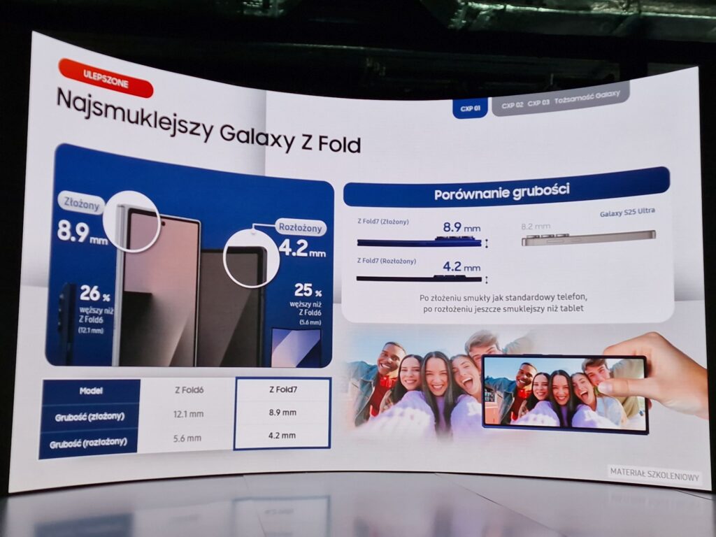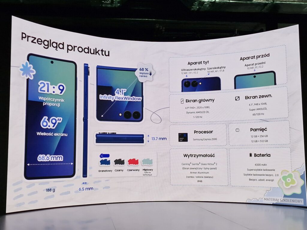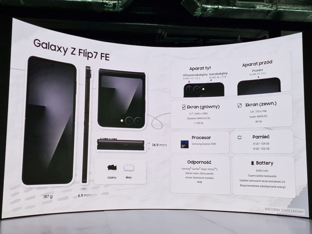 W mniejszych składakach też są zmiany, ale jednak nie tak spektakularne jak w Foldzie. Zresztą – złożony Fold jest prawie tak „gruby” jak rozłożony Flip co daje nam nieco „archaiczne” wrażenie i o żadnym „wow” w jego przypadku być nie może. Choć przecież zmiana względem poprzedniej wersji jest spora, a dotyczy ekranu zewnętrznego który jest teraz taki jak w składanej motoroli – na całej powierzchni. Z kolei model FE – który pojawił się w tej serii po raz pierwszy – ma formę zeszłorocznej 6-ki co oznacza mniejszy ekran zewnętrzny.